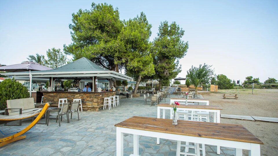 Хотелот Coral Blue Beach е сместен во осум хектари тревници кои создаваат кул оаза и ја надополнуваат прекрасната плажа на одморалиштето. Геракини е оддалечен 3 км, а аеродромот во Солун е 45 км. Приморската локација на хотелот ви овозможува да уживате во прекрасната сина вода, златната песочна плажа и блиската туристичка плажа. Хотелот се состои од неколку ниски бунгалови со сместувачки единици, а главната зграда е сместена во бујната градина.