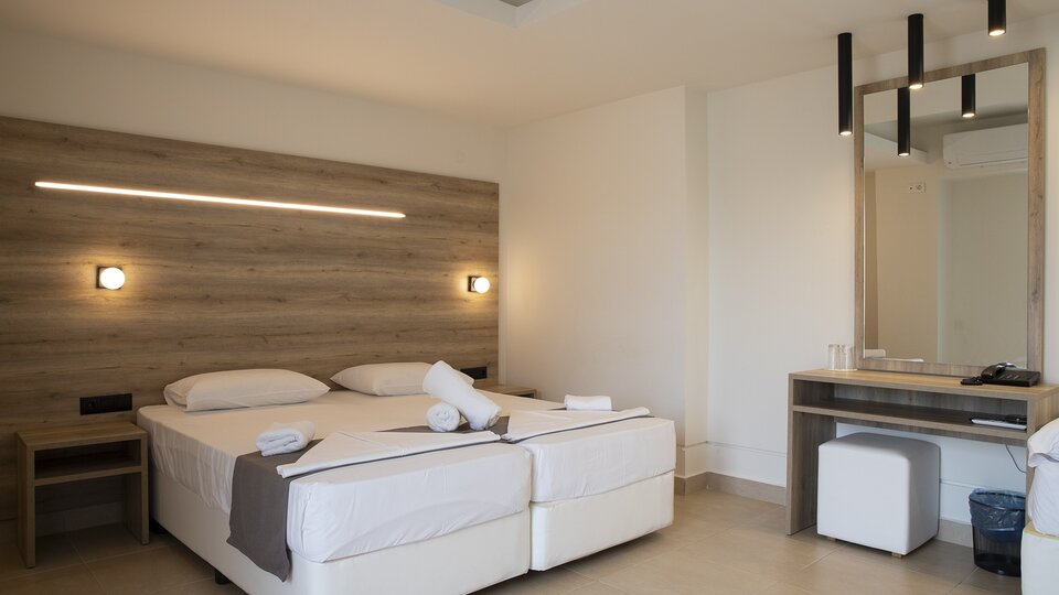 Сместен покрај брегот на плажата Лептокарија, на само 100 метри од синото море и прегрнат од величествената планина Олимп, Хотел Дафни Плус ги повикува гостите во прибежиште на удобност. Стратешки позициониран на само 200 метри од железничката станица, хотелот беспрекорно ја спојува удобноста со спокојството. Со посветеност да обезбеди удобен и релаксирачки престој, хотелот може да се пофали со 80 трокреветни и четворокреветни соби. Секоја соба не само што е функционална, туку и уникатно украсена, обезбедувајќи персонализиран допир на вашето сместување. Внимателно дизајнираните соби го прават Хотел Дафни Плус идеален избор за семејства кои бараат хармоничен спој на функционалност и стил во живописната позадина на Лептокарија.