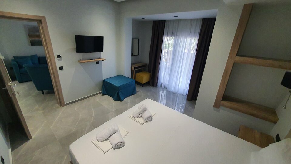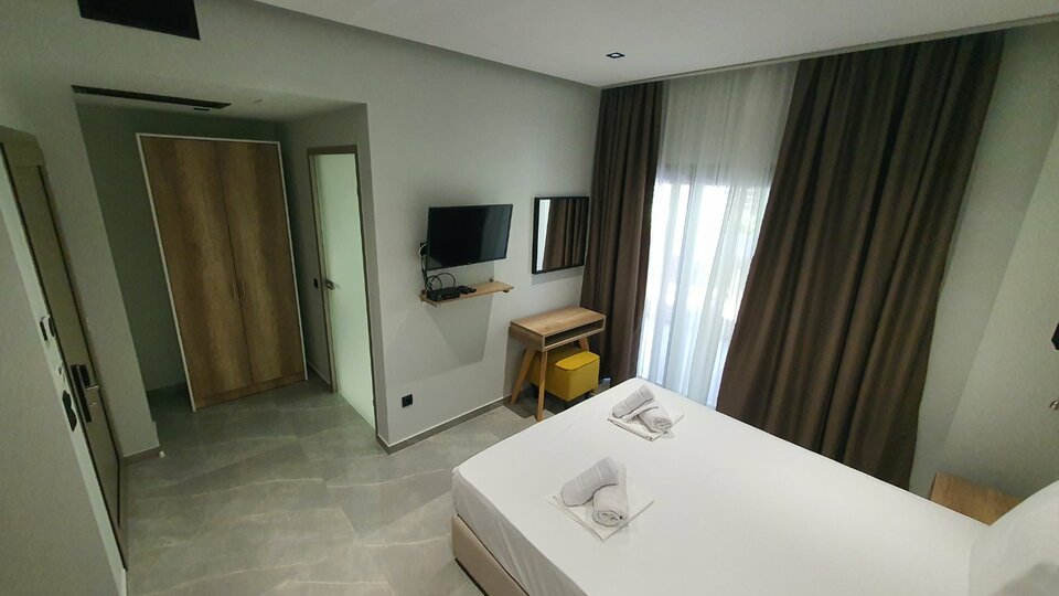 Сосема нови, луксузни, студија и апартмани лоцирани во срцето на космополитскиот Ханиоти, овој имот нуди брз пристап до јавната плажа и локалните атракции. Изградени во 2024 година, овие студија и апартмани инспирираат удобност и релаксација кај секој гостин. Имотот се состои од 15 пространи студија и апартмани распоредени на 3 ката, со соби на горниот кат со поглед на море. Има мала рецепција, лоби и брз интернет (бесплатно). Јавната плажа е на 80 метри, додека центарот и главниот плоштад се на 100 метри. Пред имотот има неколку јавни паркинг места. Локалните атракции вклучуваат шармантен јавен парк, песочна плажа, чудна локална црква, како и многу таверни, барови и продавници.